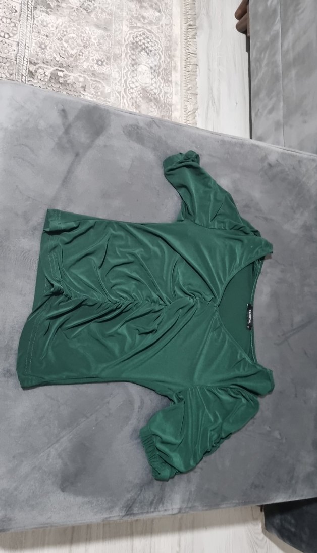 Drapeli ve V yakalı, uzun kollu yeşil bluz. Sentetik kumaştan, midi boyda, sokak ve athleisure tarzına uygun, dış mekan kullanımı için ideal.