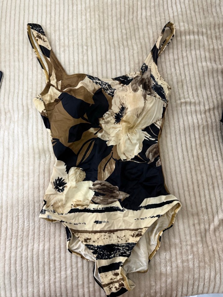Drapeli, desenli kumaştan yapılmış, kolsuz, bohem tarzda, vintage esintili, kahverengi tonlarında, vücuda oturan kadın mayo. Günlük kullanıma uygun midi uzunlukta.