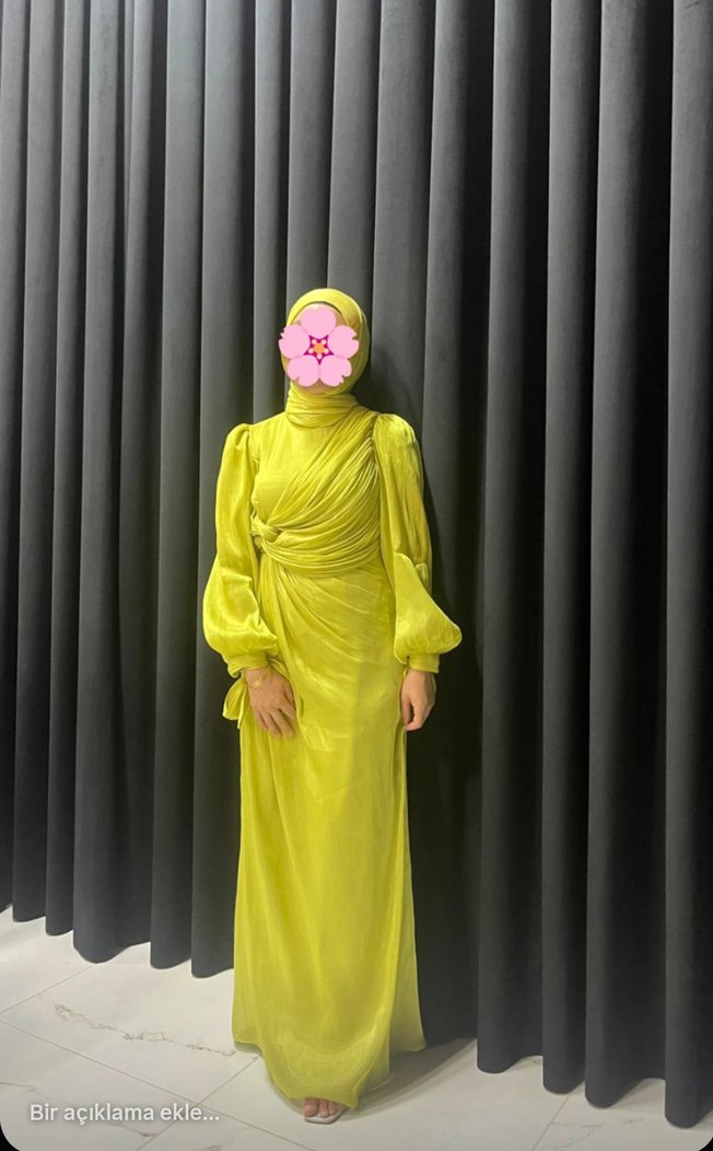 Drapeli tasarıma sahip, yüksek yakalı ve kolları fiyonklu yağ yeşili uzun abiye elbise. Ürün sadece 1 kez giyildi. Şalı da beraber gönderilecektir. Kumaşı janjandır ve şalı da abiyenin kumaşındandır. Ürün aslında 38 bedendir ama 1 kalıp dar beden olduğu için 36 beden giyene oluyor.