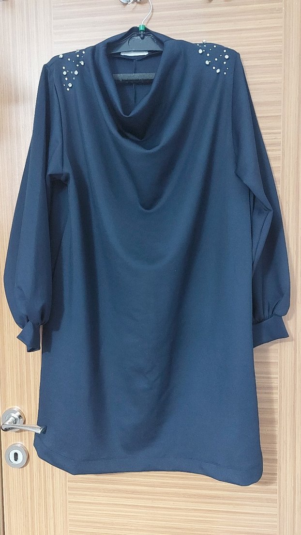 Drapeli yakalı, uzun kollu ve bol kesimli lacivert tunik. Omuzlarda taşlı süslemeler bulunur. Günlük kullanıma uygun sade ve rahat bir tasarım. scuba kumaş L