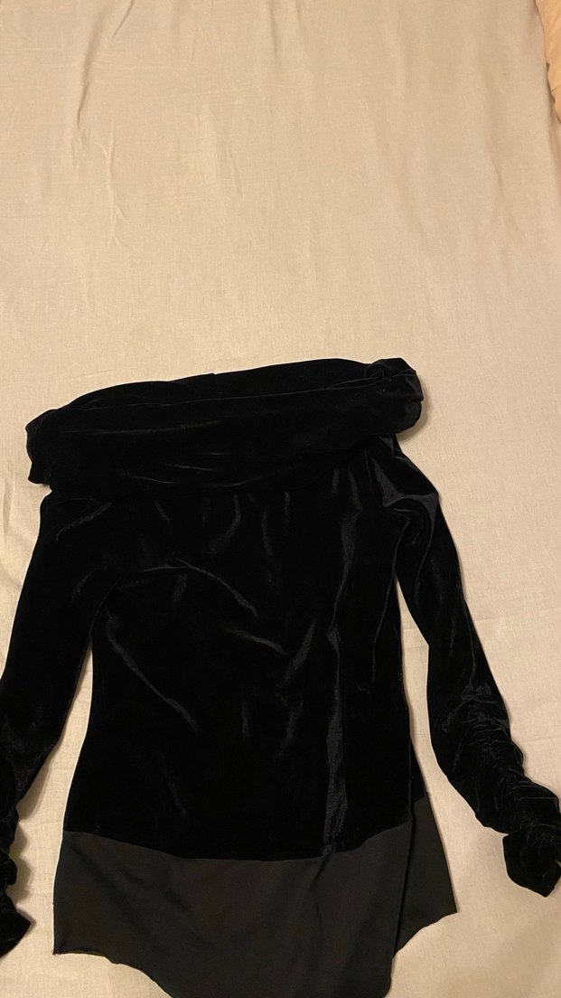 Drapeli yüksek yakalı ve uzun kollu, siyah, vücuda oturan kadın elbisesi, ofis kullanımı için uygun gotik tarzda.