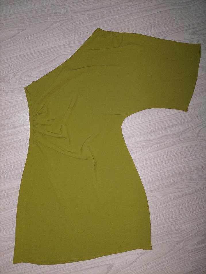 Yeşil, drapeli gece elbisesi, tekne yakalı, kolsuz ve kısa boydadır. Yumuşak sentetik kumaş hiç bir kusuru yoktur sayılı giyildi