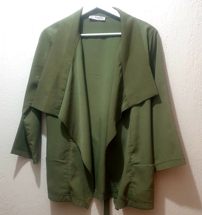 Yeşil haki renkte, drapeli ve yakalı uzun kollu kadın ceket.midi boyuyla günlük kullanıma uygun, minimalist tarzda.yumusak dokulu vatkasiz salaş şık bir ceket
