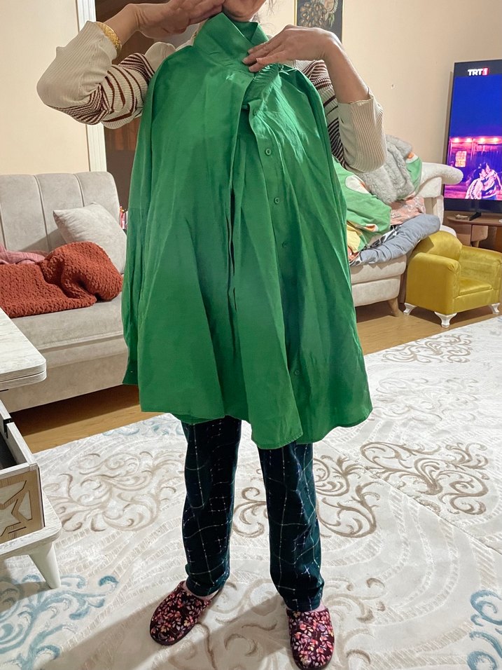 Parlak yeşil renkte, drapeli ve notalı yakalı, uzun kollu, bol kesim hamile midi kaban. Günlük kullanıma uygun, rahat ve şık bir tasarım.
