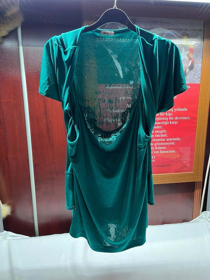 Koyu yeşil renkli tişörtü, kısa kollu ve yuvarlak yaka. İpek gibi dokusu ve drapeli baskılı tasarımıyla günlük kullanıma uygundur. Marka Syolund.