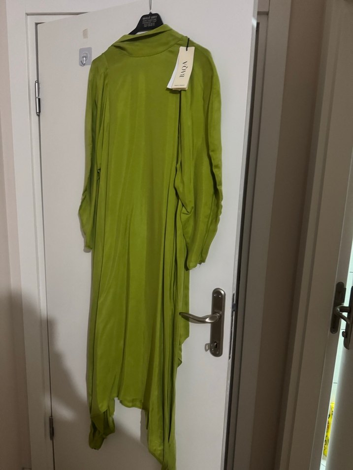 Uzun, bol kesim yeşil elbise, drapeli tasarım, uzun kollu ve yakalıdır. İpeksi kumaştan yapılmış, çağdaş ve avangart tarzda, günlük kullanıma uygundur.