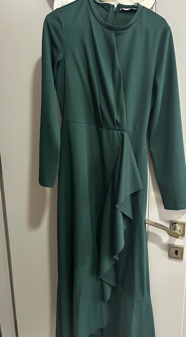 Drapeli, uzun kollu, V yaka ve yeşil renkte, sentetik kumaştan yapılmış, modern klasik stilinde, uygun, vücuda oturan uzun elbise