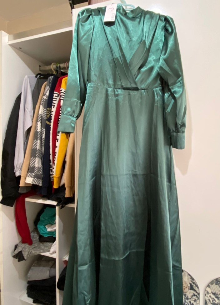 Yeşil uzun elbise, uzun kollu ve V yaka. Drapeli tasarıma sahip, sentetik yumuşak kumaştan, vintage bohem tarzında, günlük kullanıma uygun sade model.