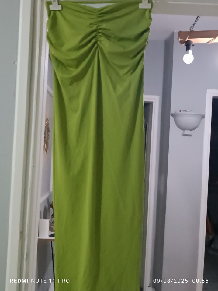 Drapeli, straplez, uzun ve yeşil parlak renkte. Yumuşak sentetik kumaştan, bohem tarzda etek yandan yırtmaçlı