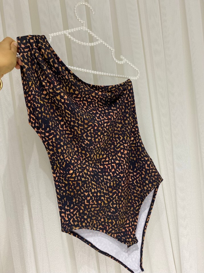 Kahverengi leopar desenli, drapeli, kolu olmayan ve vatkalı kadın Bluz.