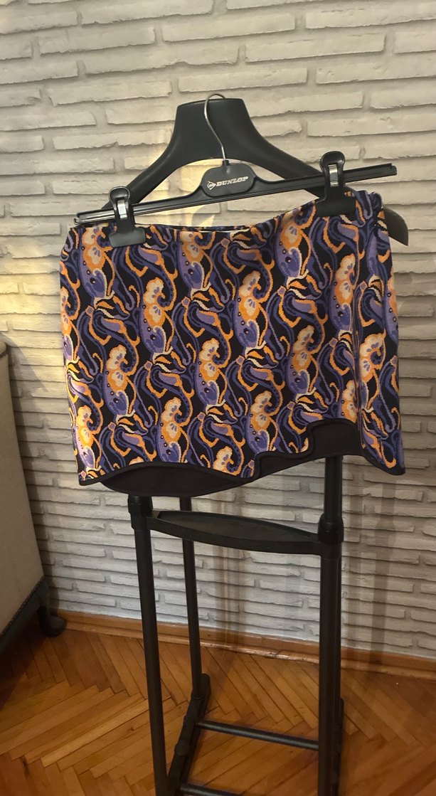Drapeli, yılan desenli, koyu mor renkli, bol kesim mini hamile eteği. Günlük kullanıma uygun bohem tarzda.