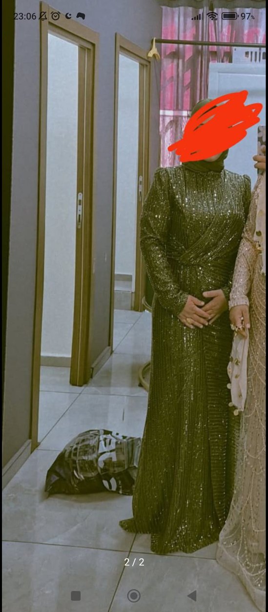 Şık yılan desenli, parlak haki renkli uzun ve dar kesim abiye elbise. 6 bine aldım ihtiyaçtan satıyorum sadece bir defa giyildi