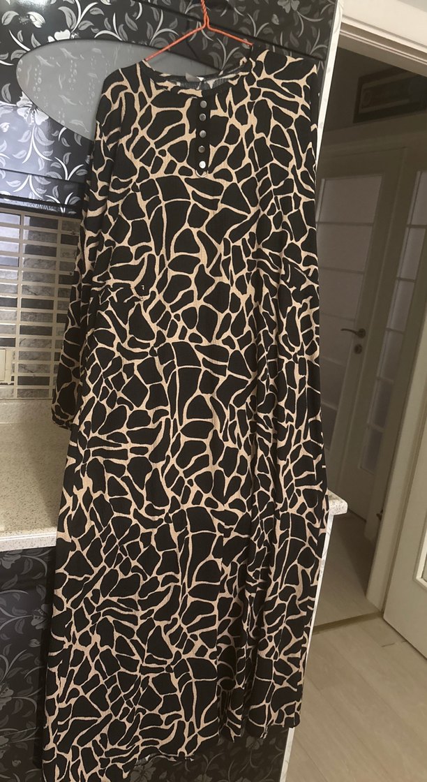 Uzun, bol kesim yılan desenli koyu kahverengi elbise. Drapeli tasarım, uzun kollu ve boğazlı, sentetik kumaştan, sokak modasına uygun.