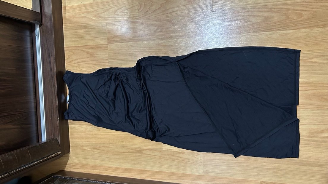 Drapeli tasarıma sahip, uzun ve vücuda oturan siyah derin yırtmaça sahip uzun elbise. Dış mekan kullanımı için uygun, normcore ve athleisure tarzında.