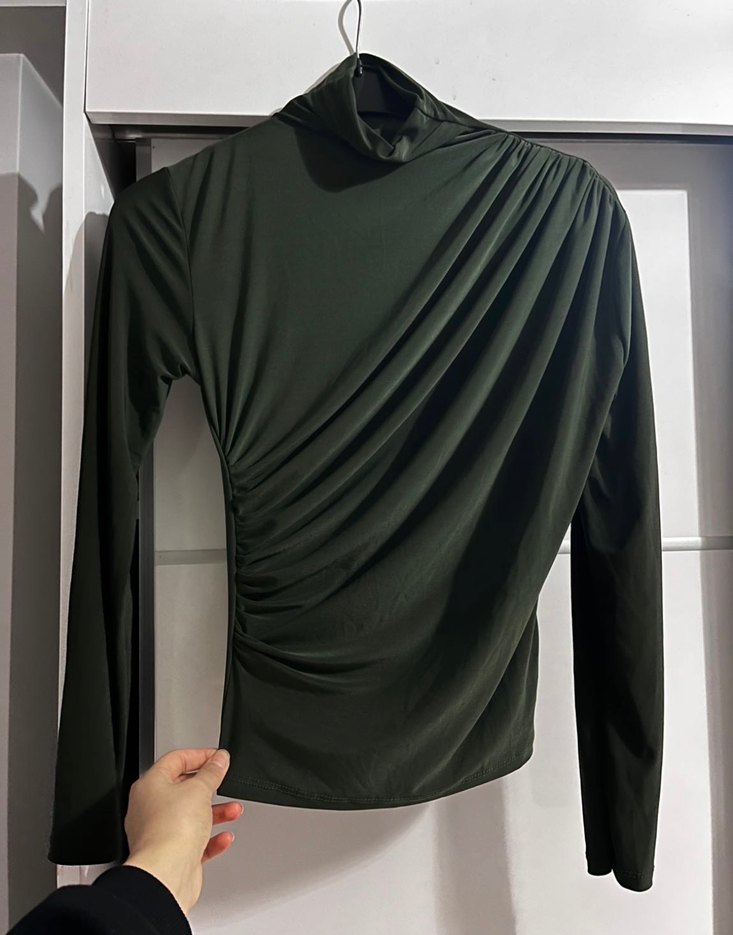 Drapeli, yüksek yakalı, dar kesim haki yeşil kadın bluz. Uzun kollu, normal midi boyda, sokak modasına uygun günlük kullanıma uygun.