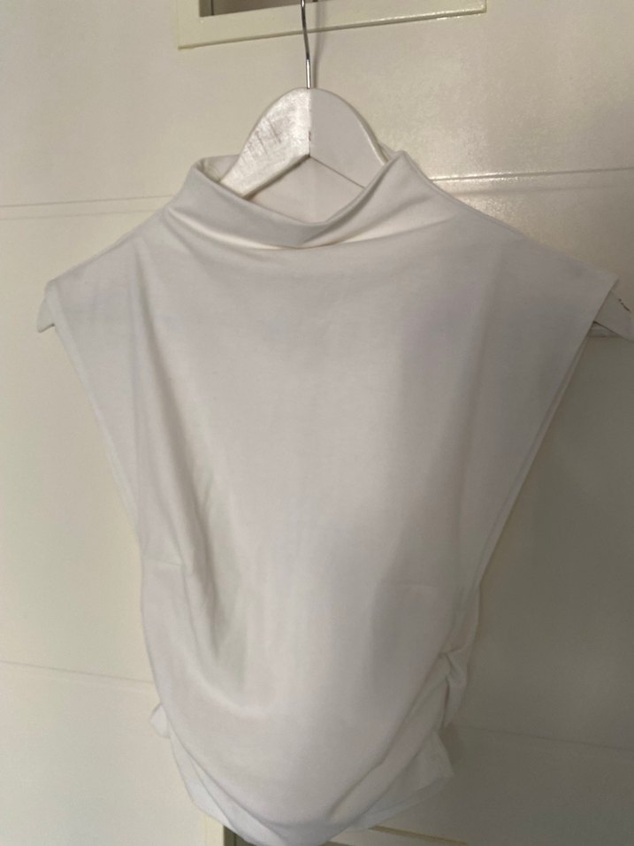 Yüksek yakalı, drapeli ve kolsuz beyaz bluz. Yumuşak keten kumaştan, sade ve şık bir günlük kullanım parçası derin koltuk altı yırtmaçlı çok az giyildi