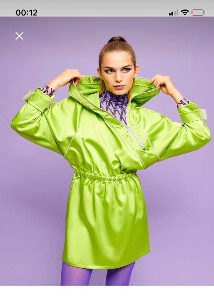 Parlak yeşil sentetik kumaştan, drapeli ve yüksek yakalı, kısa ve bol kesim bir mini yağmurluktur. Günlük kullanıma uygundur. ️