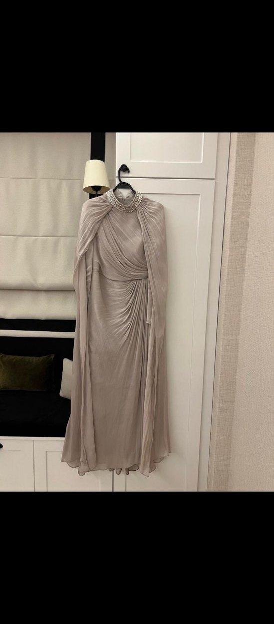 Yüksek yakalı, drapeli ve kolsuz uzun abiye elbise. Bej renginde, klasik modern ve göz alıcı bir şıklık sunar. Bej rengi.