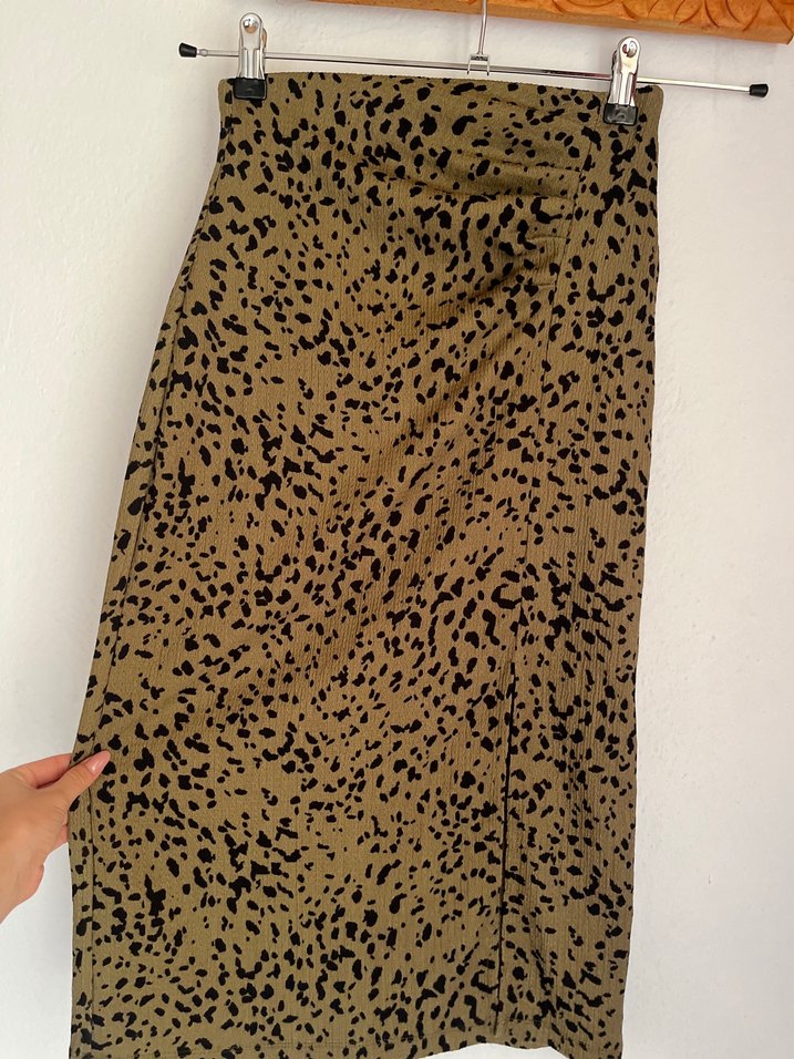 Sentetik kumaştan, yeşil yılan desenli, drapeli ve vücuda oturan uzun etek, sokak modası ve açık hava etkinlikleri için uygundur. Yırtmaçlı