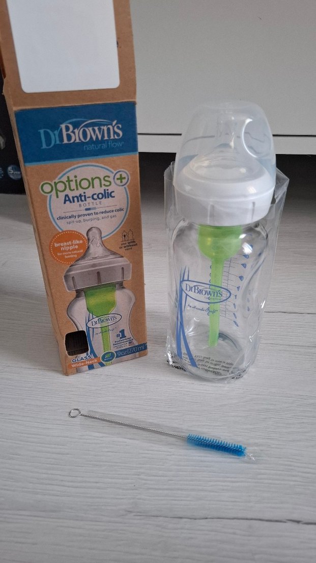 DrBrown's beyaz bebek biberonu, pastel yeşil anti-kolik havalandırma ve anne memesine benzer emzik içerir. Temizlik fırçası ve koruyucu kapak dahildir. Biberon ucu 1 numaradır, 270 ml biberon. hiç kullanılmadı kutusunda.