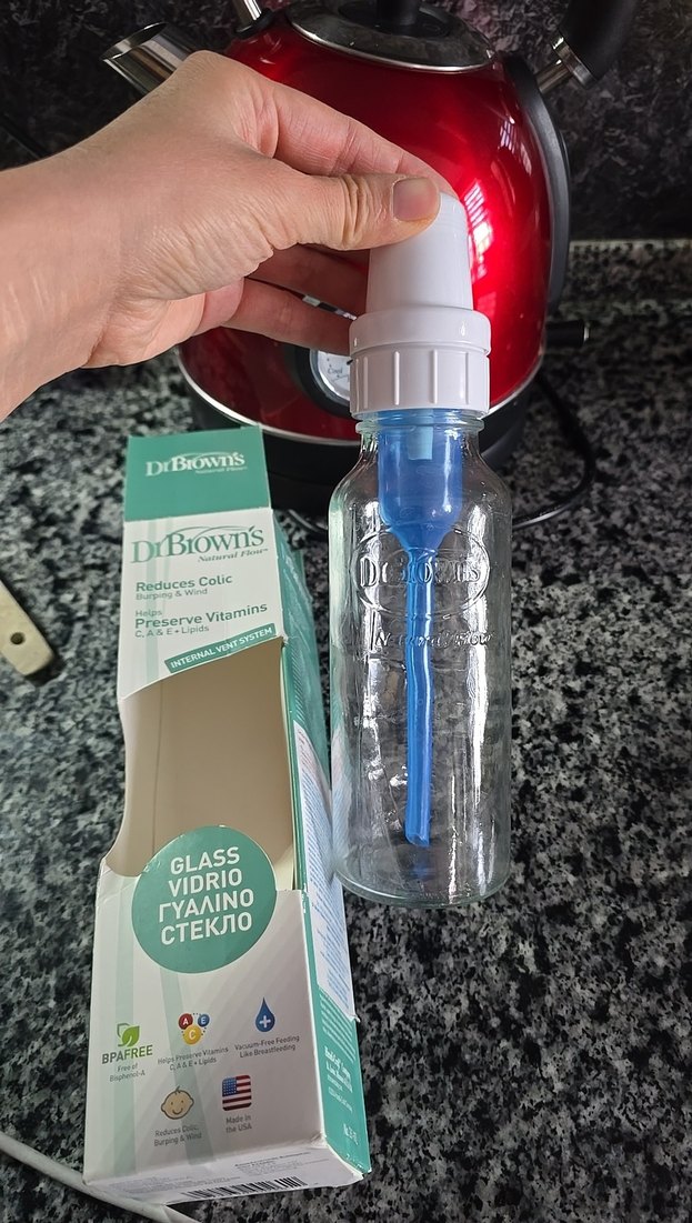 DrBrown's cam bebek biberonu beyaz renkli kapak ve mavi havalandırma sistemi içerir. Kolik azaltır ve vitaminleri korur. BPA içermez. SIFIR ÜRÜN
