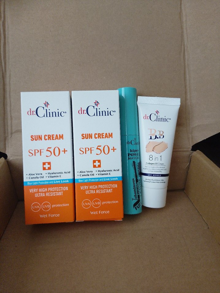 drClinic SPF 50+ güneş kremleri aloe vera ve E vitamini ile yüksek koruma ve suya dayanıklılık sağlar, ayrıca 8'i 1 arada BB krem içerir.