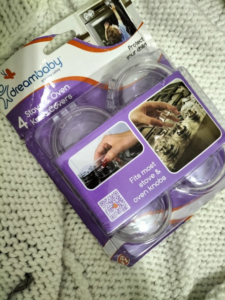 Dreambaby set, çocukları yanıklardan korumak için dört şeffaf fırın ve ocak düğmesi koruyucu içerir, çoğu düğmeye uyumludur.