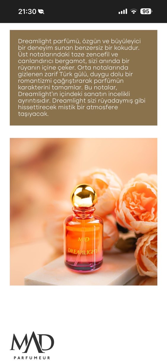 Dreamlight parfümü, romantik ve mistik notaları zarif Türk gülü ile harmanlayarak büyüleyici bir atmosfer yaratır.