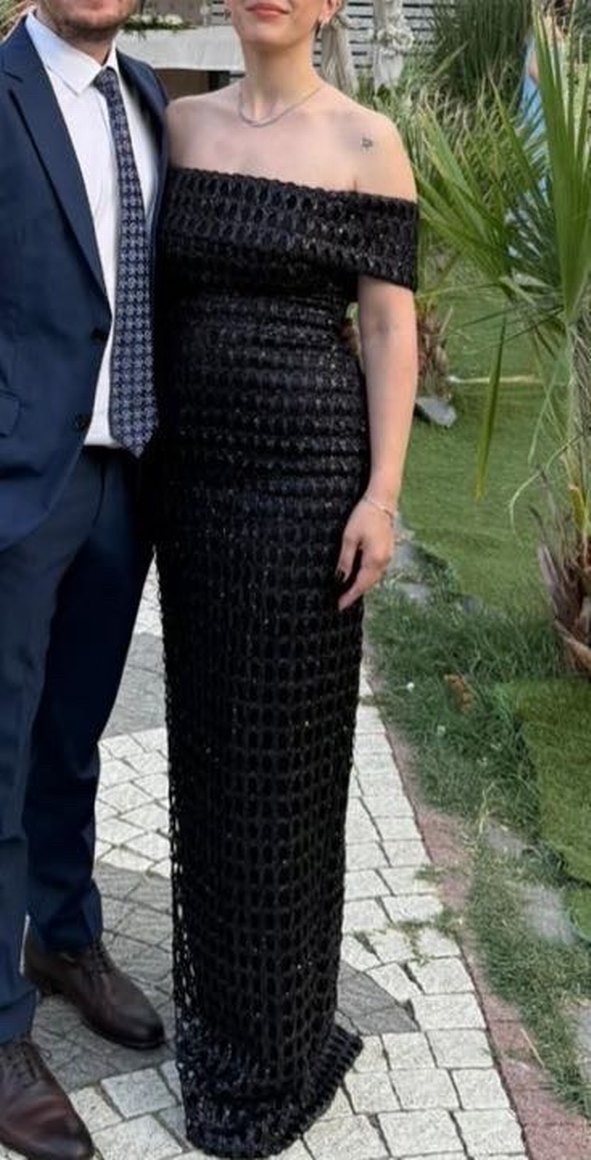 Siyah, uzun, vücuda oturan gece elbisesi, kayık yaka ve omuzları açık kollara sahiptir. Yalnızca bir gece giyildi. 1 beden yani smalldur yalnızca boyundan beş cm kısaltılmıştır.