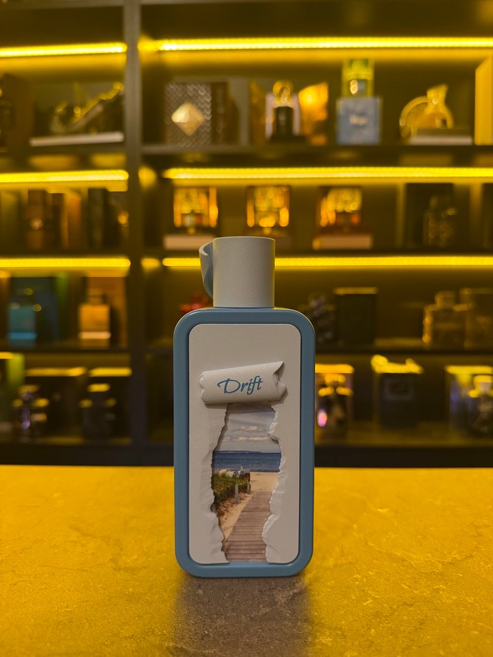 Drift erkek parfümü, gri ve mavi renkte, sokak stilini yansıtan bir tasarıma sahiptir. Ambalajda kıyı manzarası yer alır.
