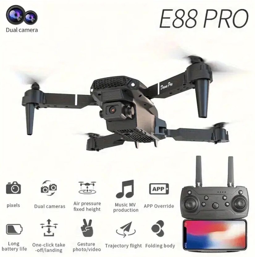 Ürün sıfırdır. Üç bataryası mevcuttur. 1080P kayıt özelliği vardır. Bir batarya ile 10/15 dakika uçuş süresi vardır. Detaylı bilgi için iletişime geçebilirsiniz. Siyah renk E88 E99 drone, çift kamera, havada sabit kalabilme, tek tıkla kalkış/iniş, uygulama kontrolü, rota uçuşu ve katlanabilir gövde özelliklerine sahiptir.