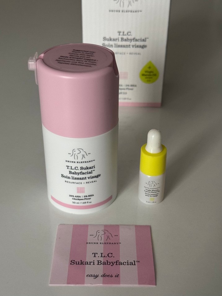 Drunk Elephant T.L.C. Sukari Babyfacial, %25 AHA ve %2 BHA içeren, cildi pürüzsüzleştiren ve yenileyen yüz bakım ürünü. Saf marula yağı içerir. Hiç kullanılmadı, kapağı açılmadı, sıfır ürün. Sephora faturalı.