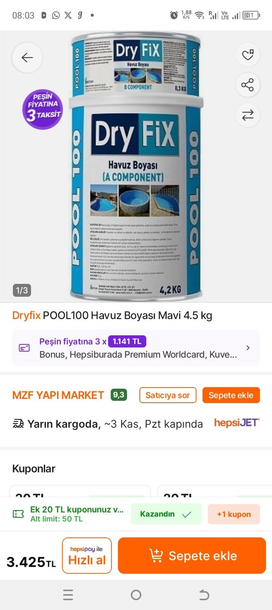 Dryfix POOL100, 4.5 kg ağırlığında mavi renkte dayanıklı fayans,seramik ,havuz boyasıdır. Havuz yüzeylerini etkili şekilde kaplar. ️