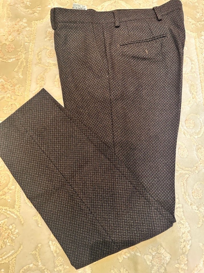 Kahverengi, regular fit, normal boyda, sentetik kumaştan, kemerli erkek pantolonu, ofis kullanımı için uygundur. 48 beden