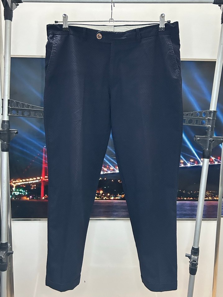 Lacivert renkli, regular fit kesim, pile detaylı ve midi boy erkek pantolon. Sentetik kumaştan üretilmiş, ofis için uygun. 52 Beden