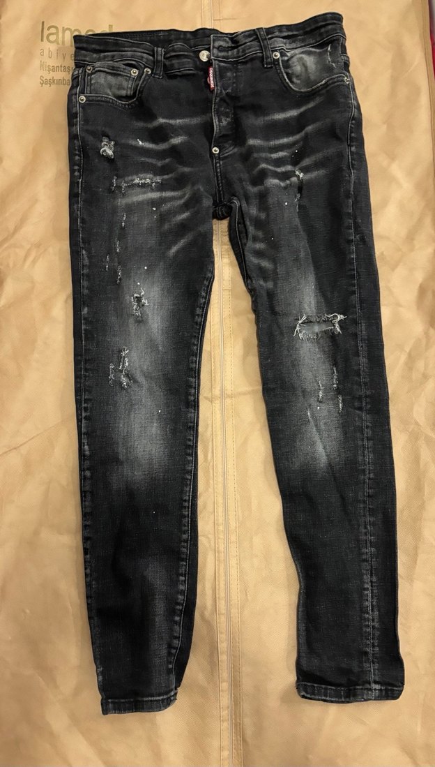 Arka kısımdaki dsquared yazısı çıkık Siyah renkli, bol kesim, tokalı erkek kot pantolon. Midi boyda, yıpratılmış görünümde, günlük kullanım için uygun.