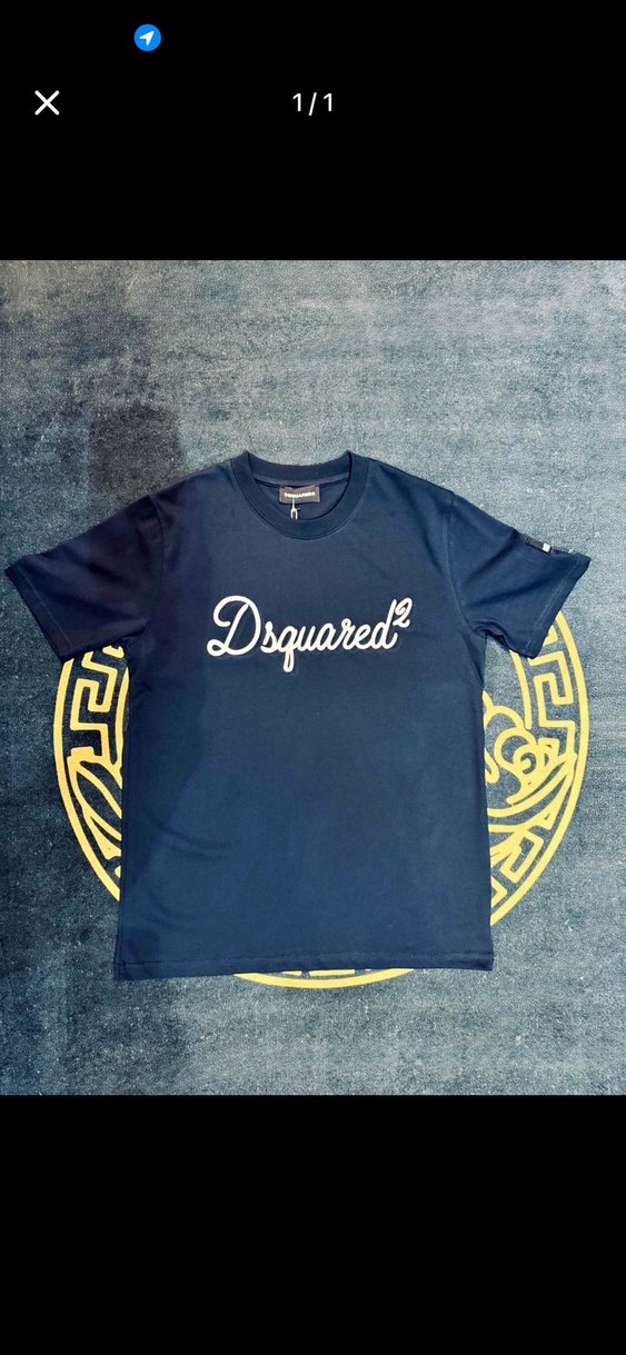 Lacivert renkli, kısa kollu, yuvarlak yakalı erkek tişörtü. Önünde baskılı Dsquared logosu ve rahat kesimiyle günlük sokak stili için uygun.
