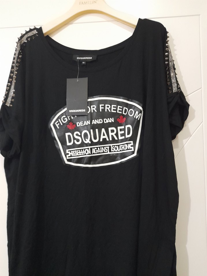Kısa kollu, yuvarlak yakalı, kemerli ve bol kesim siyah pamuk tişört. Önünde DSQUARED baskısı ve omuzlarda çivili detaylar bulunur. Günlük kullanıma uygun.