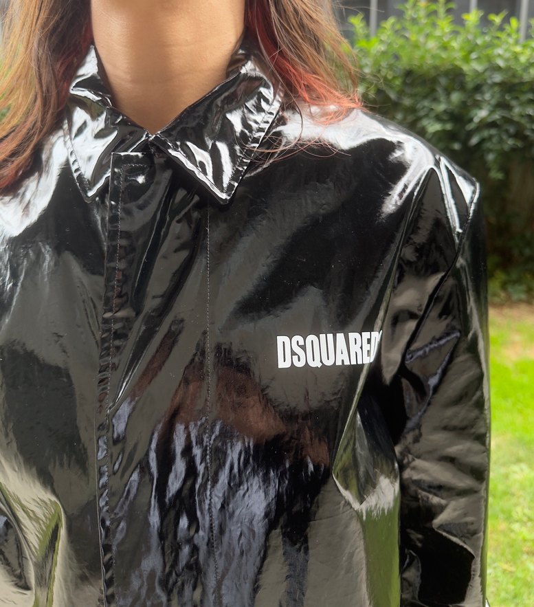 DSQUARED siyah, parlak plastik kumaştan, yakalı ve uzun kollu, bol kesim midi uzunluğunda yağmurluk. Sokak stili için ideal, baskılı logo detaylı.