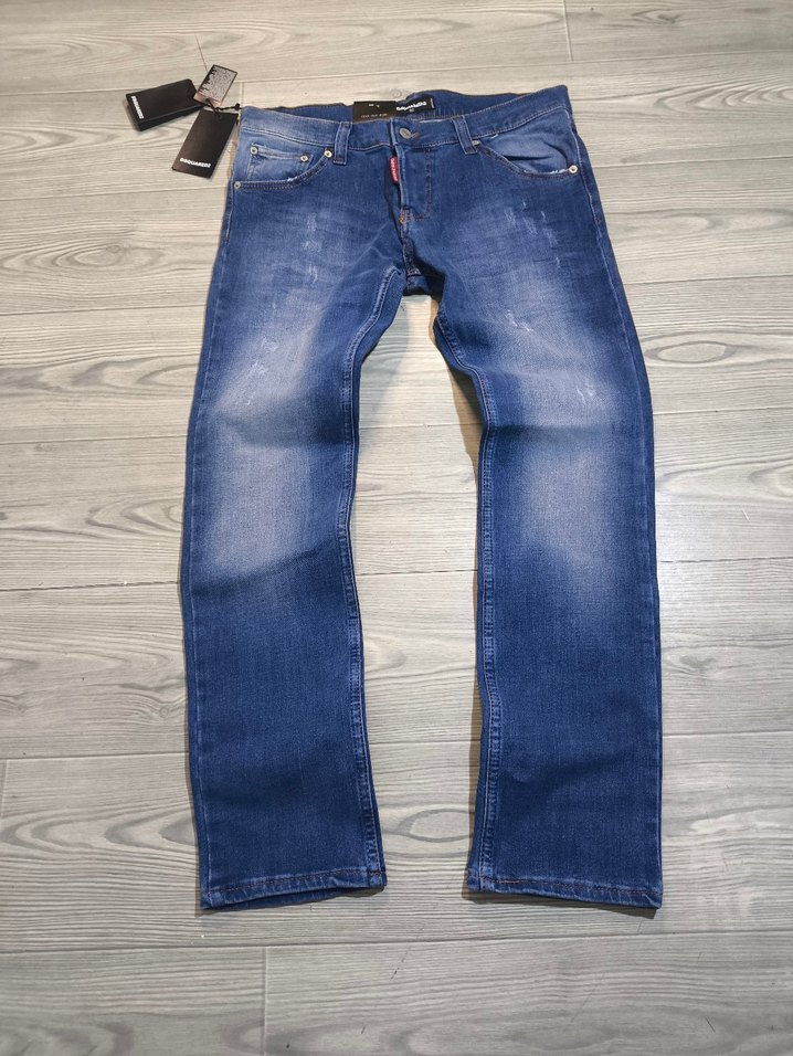 Erkekler için parlak mavi denim kot pantolon, normal boy ve regular fit. Kemer tokası detaylı, günlük sokak tarzına uygun.