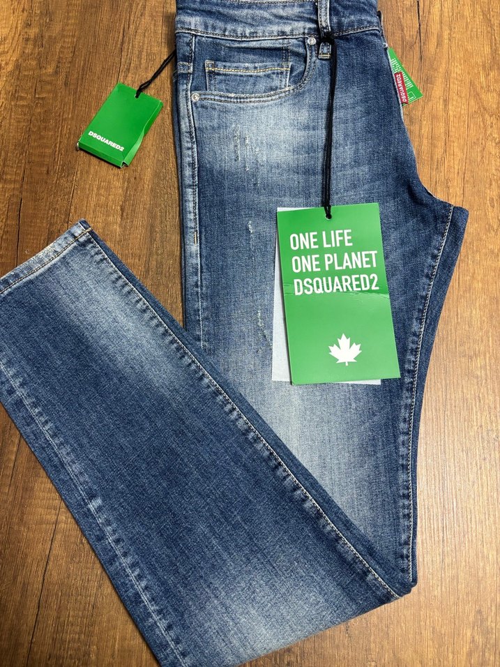 DSQUARED2 marka, baskılı detaylı, regular fit erkek denim pantolon. Hafif yeşil etiketli, günlük sokak stili için uygun.