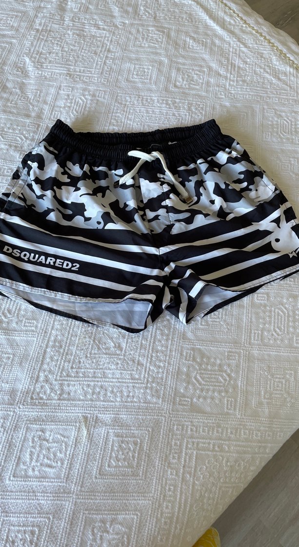Dsquared2 marka, kamuflaj desenli, sıkı kesim erkek mini şort. Siyah beyaz çizgili ve tokalı bel detaylı, dış mekan kullanımı için uygundur.
