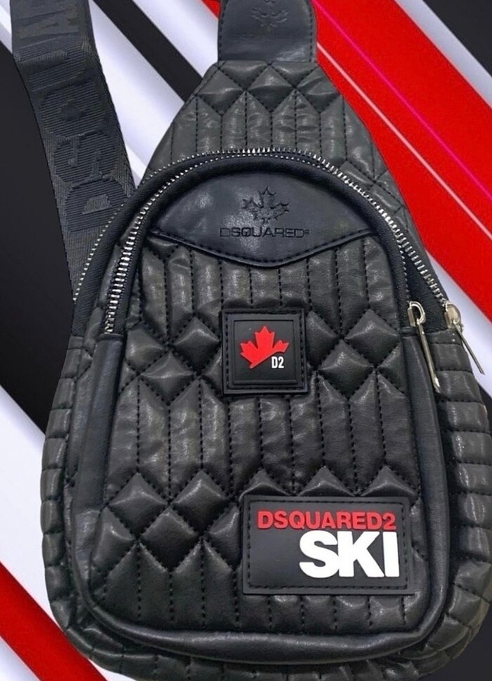 Dsquared2 markalı siyah biker omuz çantası, kapitone detaylı, tokalı ve baskılı logolu, spor athleisure tarzında, rock punk havası taşıyor.