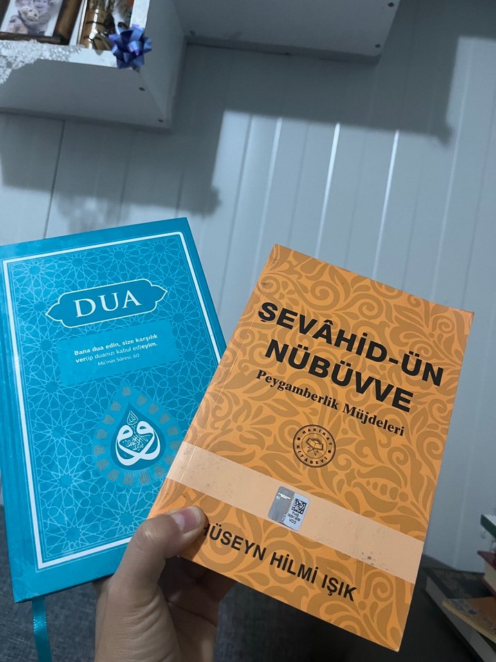 Mavi kapaklı 'Dua' adlı dini kitap, ince desenler ve ayraçlıdır. İçerisinde dualar ve manevi metinler bulunur. Orta boy sert kapak Şevahidün nübüvve / peygamberlik müjdeleri 2’li göndereceğim