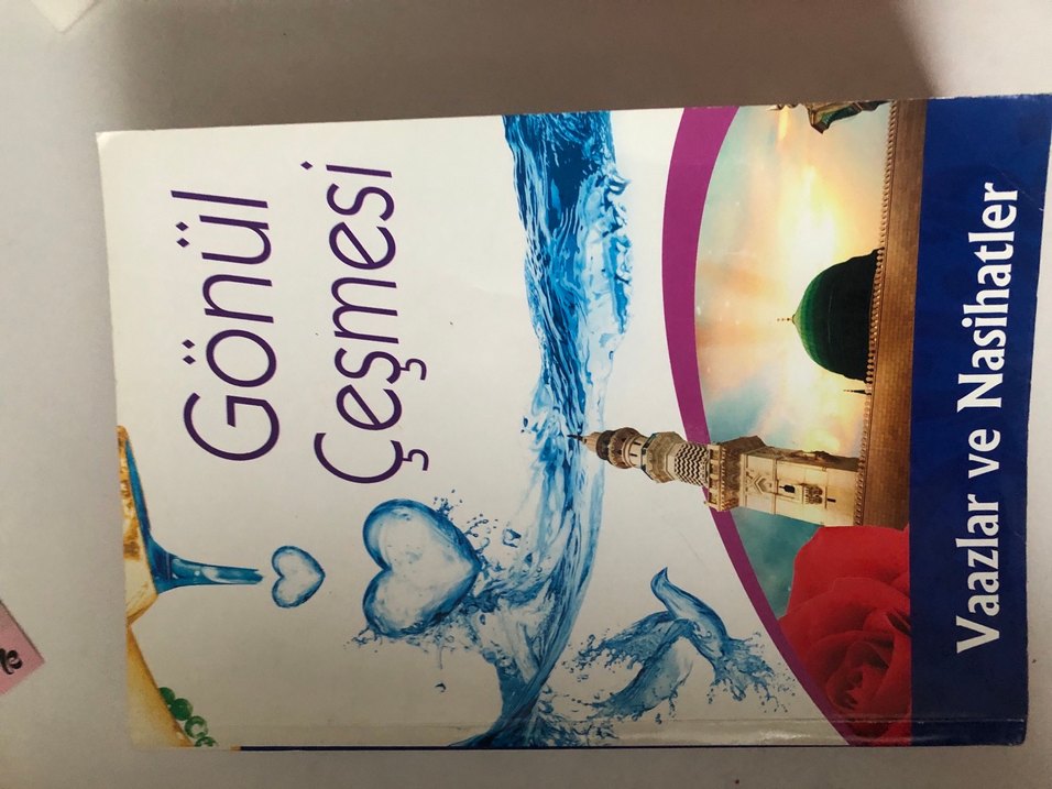 Dua ve inanç temalı, kapağında su kalpleri ve cami minaresi bulunan dini kitap.
