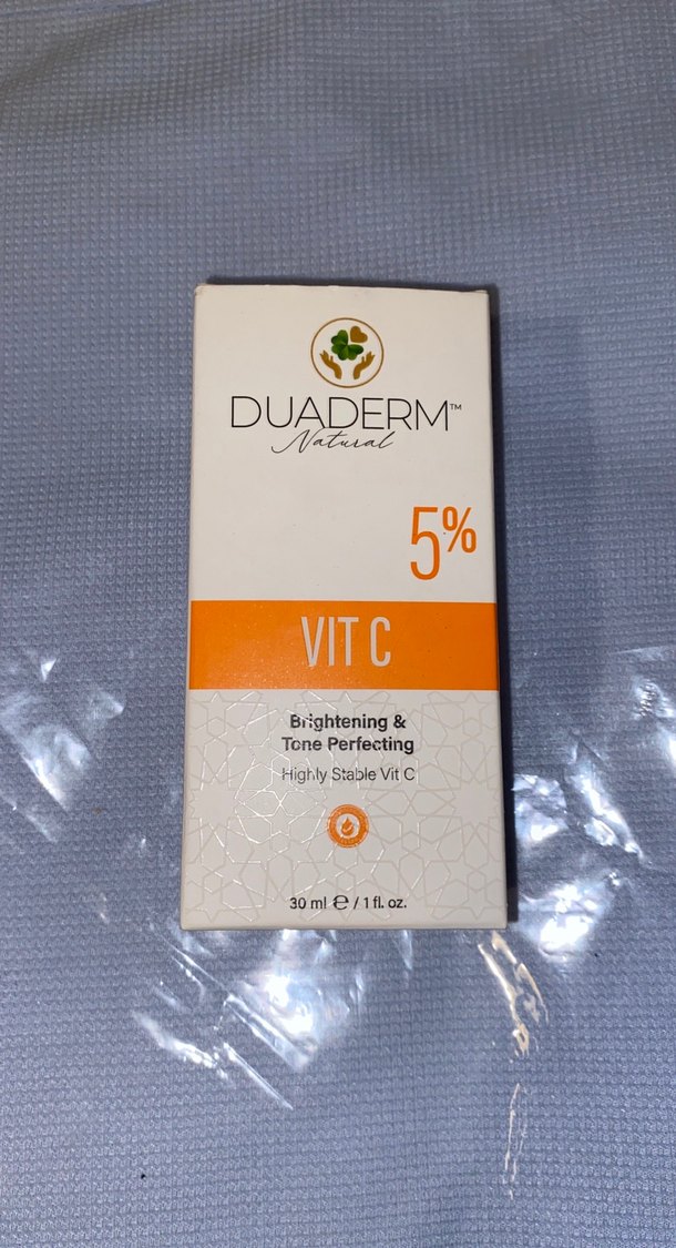 Duaderm %5 Vitamin C serumu, cildi aydınlatır ve tonunu eşitler. Yüksek stabiliteye sahip vitamin C içerir. 30 ml şişede. aydınlatıcı tonda engelleyici ve nemlendirici günlük bakım serumu. C vitaminli serum ilaç değildir kozmetik bir üründür. Haricen kullanılır. kullanmadan önce bileğinizin iç kısmında test ediniz. on 15 dakika bekledikten sonra herhangi bir alerjik reaksiyon olmaması halinde yüzünüze uygulayınız. Ürün çeyreğin ki herhangi bir maddeye karşı hassasiyeti olan kişilerin kullanması tavsiye edilmez. Güneşe çıkmak durumuna kaldığınızda bu ürünü kullanmamanız tavsiyedir. Toplu alım yapmayınız özel ilan açtırınız. 250 TL ve ve üzeri alışverişlerde 44.90 TL kargo parası ücrete ekliyorum.