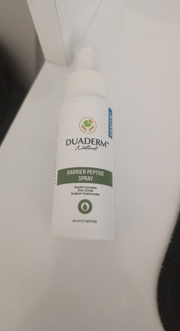 Duaderm Barrier Peptid Sprey, peptid kompleksi, çinko oksit ve sodyum hiyalüronat içerir. 50 ml sprey şişede sunulur.