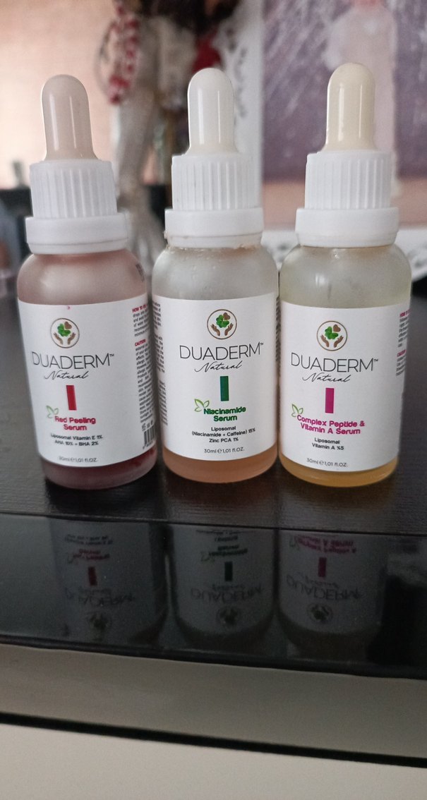 Duaderm anti-aging serumlar, cilt yenilenmesini destekleyen Kırmızı Peeling, Niacinamide ve Kompleks Peptit & Vitamin A formüllerini içerir.