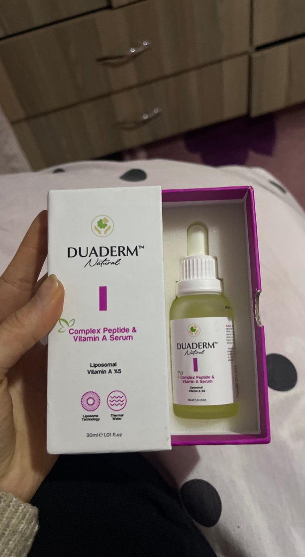 Duaderm Kompleks Peptit ve Vitamin A Serumu, liposomal Vitamin A ile cilt yenilenmesini destekler. 30 ml damlalıklı şişede sunulur.