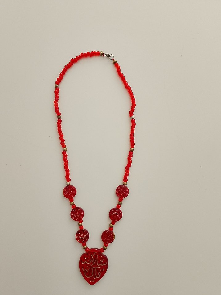Uzun kırmızı boncuklardan oluşan, yılan desenli kalp şeklinde kolye ucu ile bohem tarzı bir kolye.